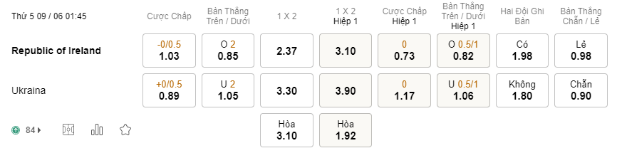 Soi kèo hiệp 1 Ireland vs Ukraine: 0.73*0*1.17