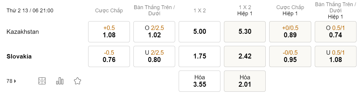 Tỉ lệ kèo Kazakhstan vs Slovakia