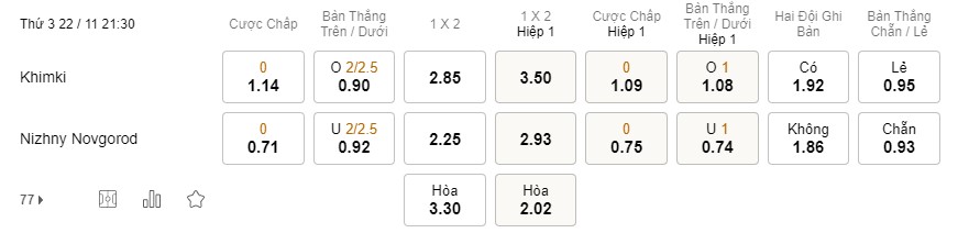 Tỉ lệ kèo Khimki vs Nizhny Novgorod