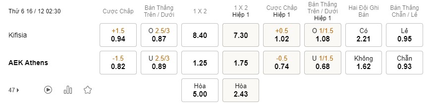 Tỉ lệ kèo Kifisia vs AEK Athens