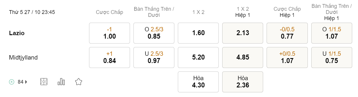 Soi kèo châu Á Lazio vs Midtjylland: 1.00*1*0.84