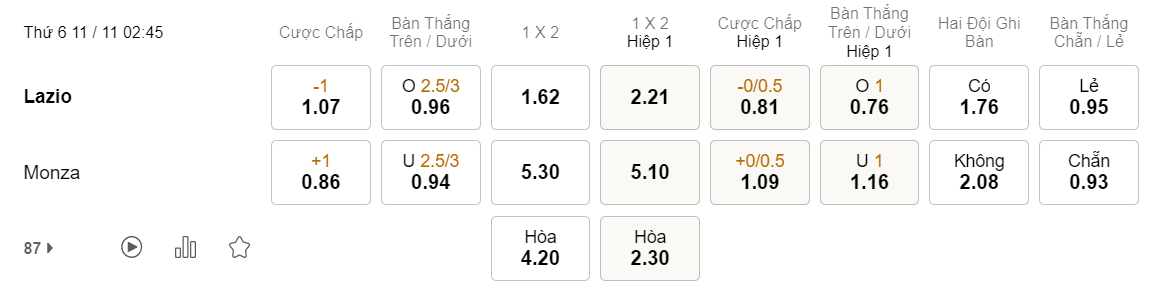 Tỉ lệ kèo Lazio vs Monza