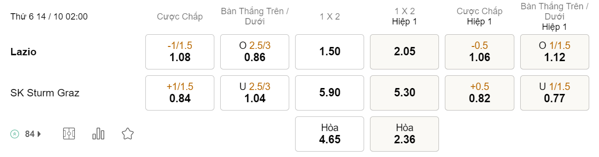 Soi kèo châu Á Lazio vs Sturm Graz: 1.08*1/1.5*0.84