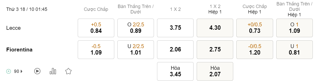Soi kèo châu Á Lecce vs Fiorentina: 0.84*0.5*1.09