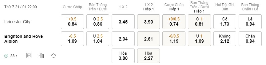 Tỉ lệ kèo Leicester vs Brighton
