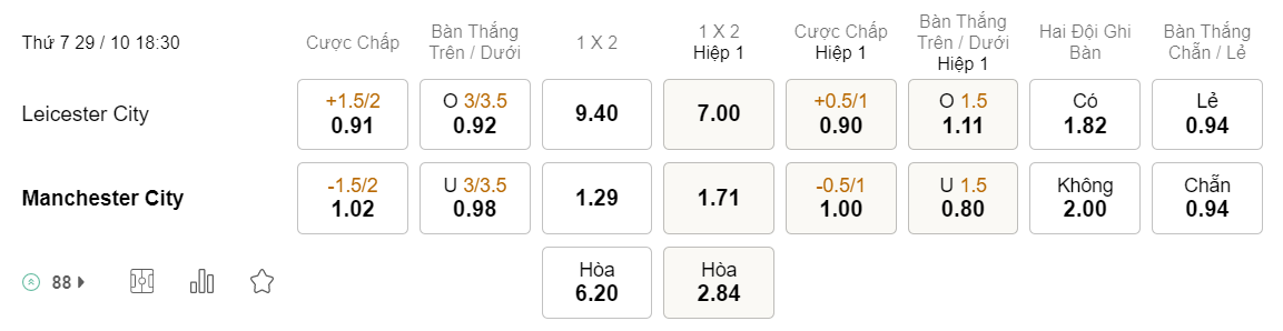 Soi kèo hiệp 1 Leicester vs Man City: 0.90*0.5/1*1.00