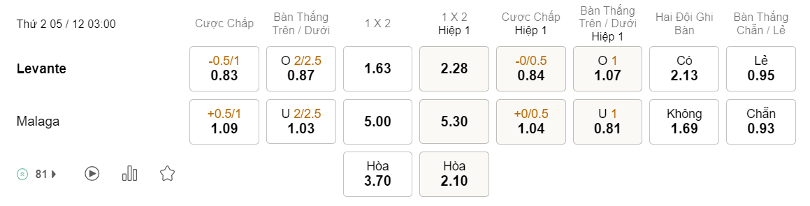 Tỉ lệ kèo Levente vs Malaga