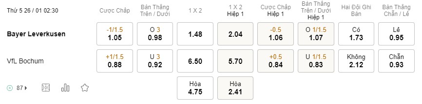 Soi kèo châu Á Leverkusen vs Bochum: 1.05*1/1.5*0.88