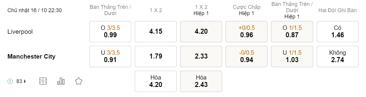 Soi kèo hiệp 1 Liverpool vs Man City: 0.96*0/0.5*0.94