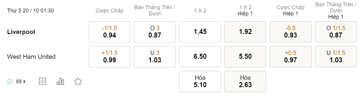 Soi kèo châu Á Liverpool vs West Ham: 0.94*1/1.5*0.99