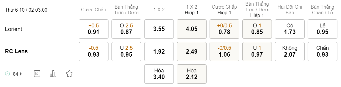 Soi kèo hiệp 1 Lorient vs Lens: 0.78*0/0.5*1.06