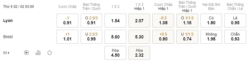 Tỉ lệ kèo Lyon vs Brest
