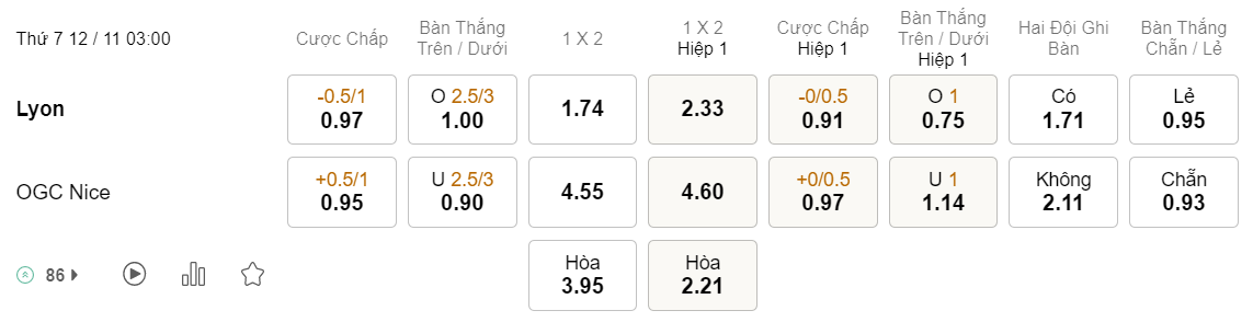 Tỉ lệ kèo Lyon vs Nice