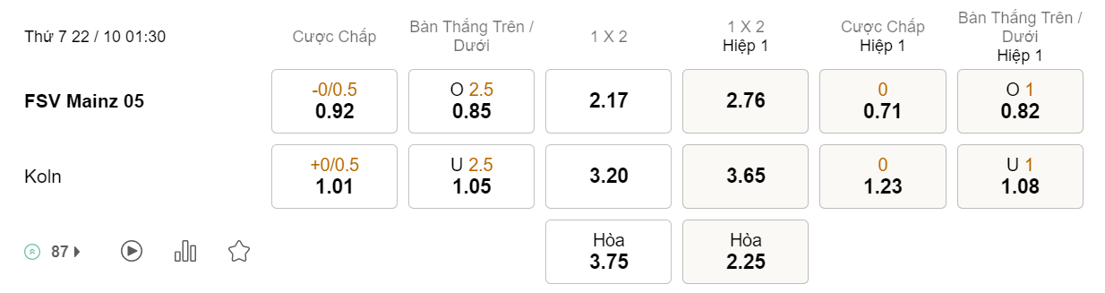 Soi kèo hiệp 1 Mainz vs Cologne: 0.71*0*1.23