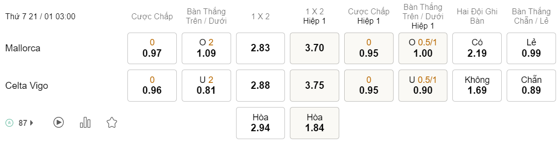 Tỉ lệ kèo Mallorca vs Celta Vigo