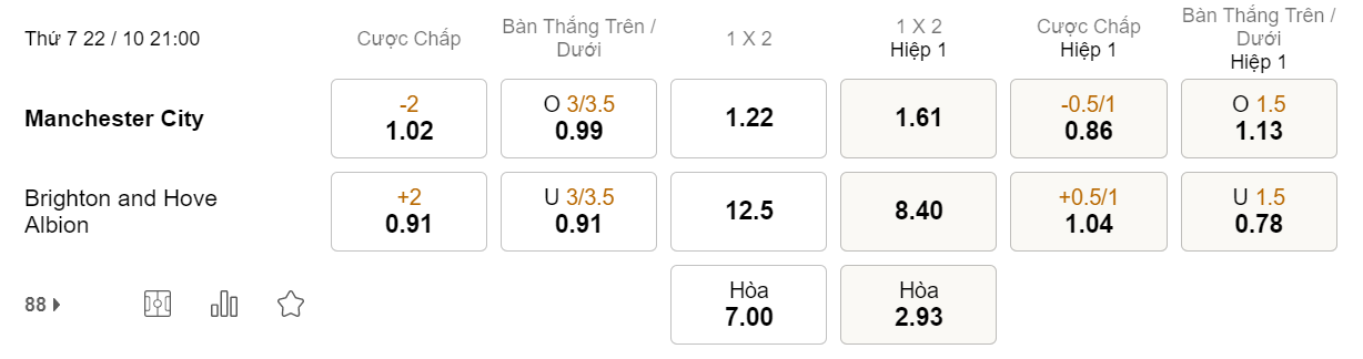 Soi kèo châu Á Man City vs Brighton: 1.02*2*0.91