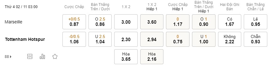 Soi kèo châu Á Marseille vs Tottenham: 0.87*0/0.5*1.06