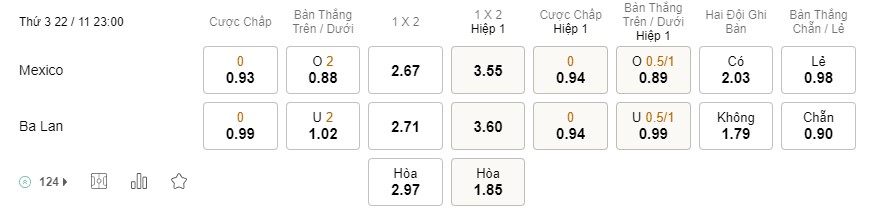 Soi kèo tài xỉu Mexico vs Ba Lan: 0.88*2*1.02