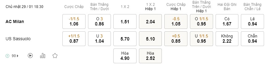 Soi kèo hiệp 1 Milan vs Sassuolo: 1.05*0.5*0.85