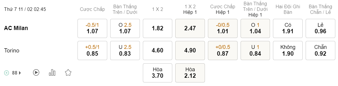 Soi kèo hiệp 1 Milan vs Torino: 1.01*0/0.5*0.87
