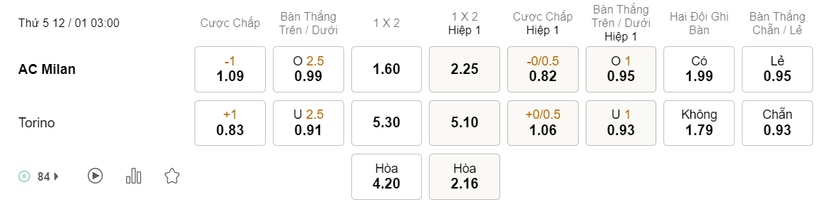 Soi kèo hiệp 1 Milan vs Torino: 0.82*0/0.5*1.06
