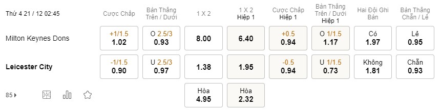 Tỉ lệ kèo Milton Keynes Dons vs Leicester