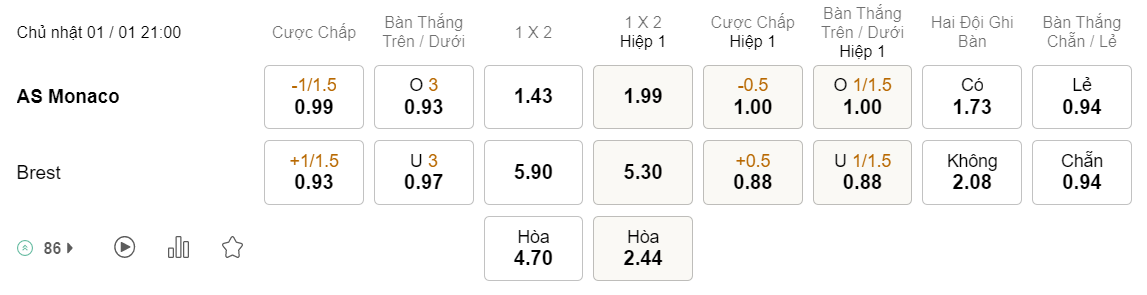Tỉ lệ kèo Monaco vs Brest