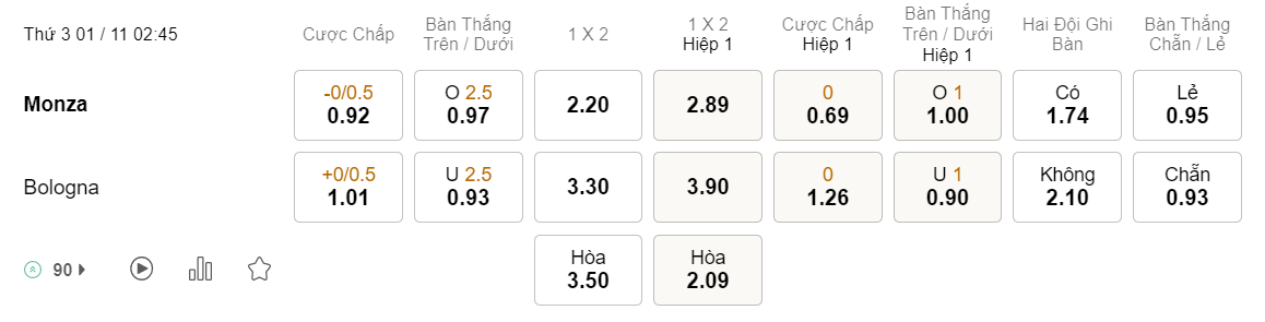Soi kèo tài xỉu Monza vs Bologna: 0.97*2.5*0.93