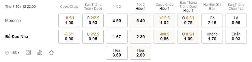 Tỉ lệ kèo Morocco vs Bồ Đào Nha