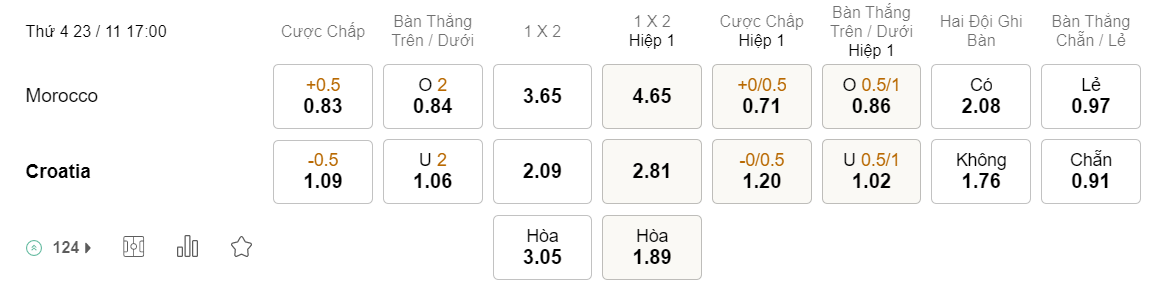 Soi kèo hiệp 1 Morocco vs Croatia: 0.71*0/0.5*1.20