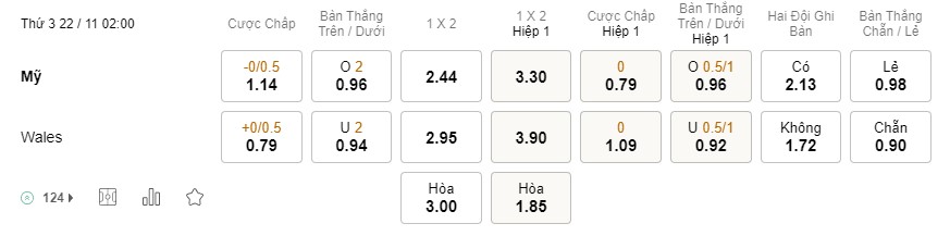 Tỉ lệ kèo Mỹ vs Wales