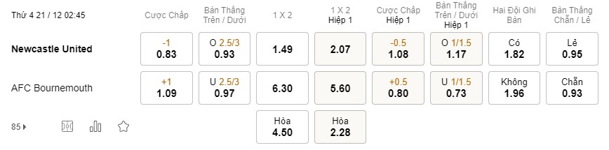 Tỉ lệ kèo Newcastle vs Bournemouth