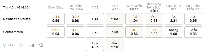 Soi kèo Châu Á Newcastle vs Southampton: 0.99*1/1.5*0.94