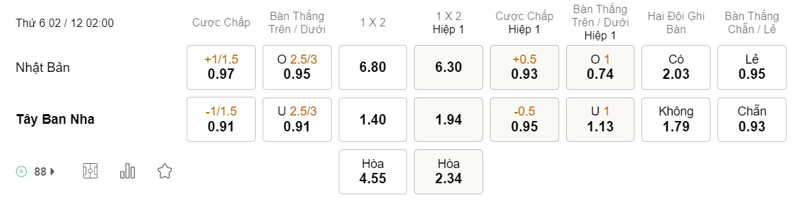 Tỉ lệ kèo Nhật Bản vs Tây Ban Nha