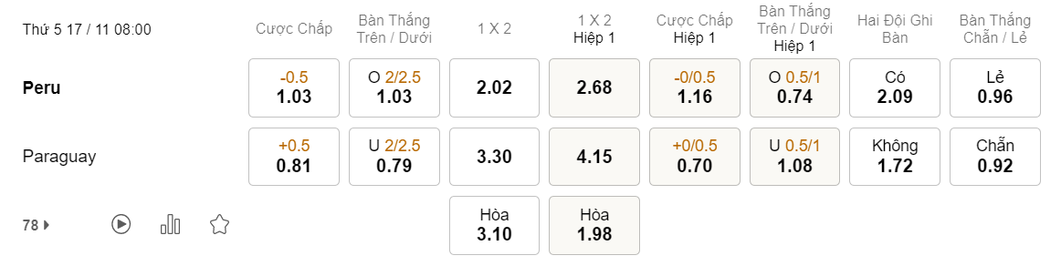 Như đã phân tích, Peru đang có phong độ tốt và sức tấn công của họ cũng vô cùng ấn tượng. Thống kê cũng chỉ ra đội bóng này đã ghi bàn vào lưới Paraguay ngay trong hiệp 1 ở ¾ lần gần nhất trạm chán. Vì vậy khả năng cao họ sẽ làm được điều tương tự trong trận đấu tới đây.