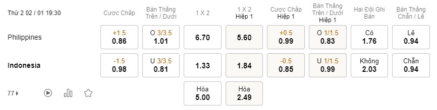Tỉ lệ kèo Philippines vs Indonesia