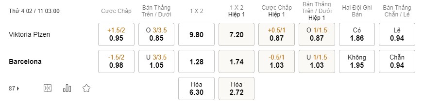 Soi kèo hiệp 1 Plzen vs Barcelona: 0.87*0.5/1*1.03