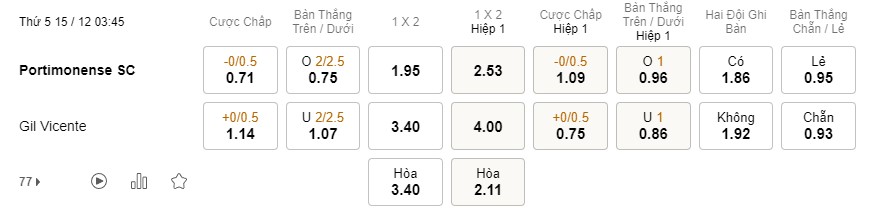 Soi kèo hiệp 1 Portimonense vs Gil Vicente: 1.09*0/0.5*0.75