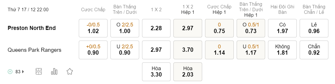 Như đã phân tích, với sự hưng phấn đang có được, các cầu thủ Preston sẽ chủ động dồn lên tấn công ngay từ những phút đầu. Theo thống kê, 5/6 lần gần nhất Preston trạm chán QPR, bàn thắng đã tới ngay ở 45 phút đầu tiên. Do đó, khả năng cao Đội chủ nhà sẽ tiếp tục có được điều mình cần ngay ở hiệp 1 trận đấu này.