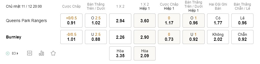 Soi kèo hiệp 1 QPR vs Burnley: 1.17*0*0.73