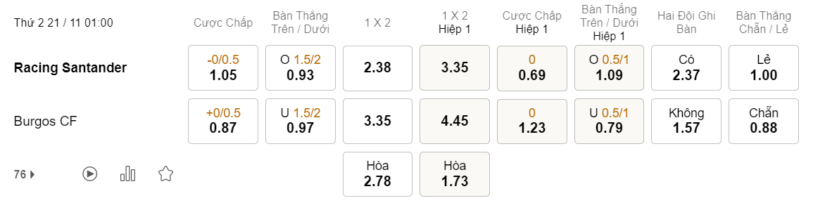 Soi kèo hiệp 1 Racing Santander vs Burgos: 0.69*0*1.23