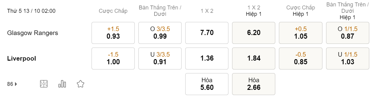 Soi kèo châu Á Rangers vs Liverpool: 0.93*1.5*1.00