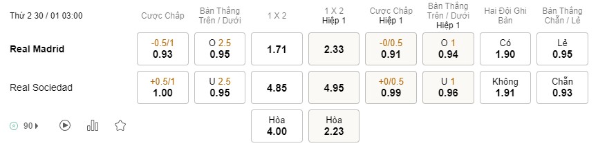 Soi kèo châu Á Real Madrid vs Sociedad: 0.93*0.5/1*1.00