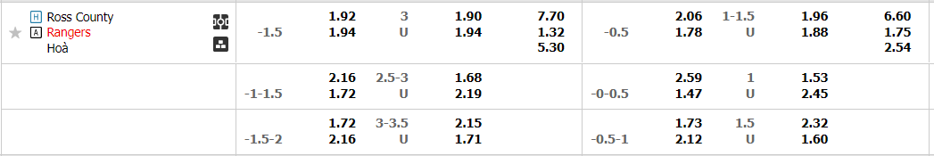 Với 75% tỷ lệ thắng kèo sau 4 trận gần nhất, Rangers đang là cửa đặt mang lại khá nhiều lợi nhuận. Khả năng thắng kèo của Rangers càng trở nên chắc chắn hơn, khi mà có 4 trong 5 trận mở kèo gần nhất giữa hai đội, họ đã giành được chiến thắng. Do đó, với việc chấp 1.5 bàn trước Ross County, các chuyên gia đang đánh giá cao Rangers sẽ là lựa chọn an toàn hơn trong trận kèo này.