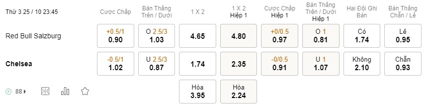 Soi kèo hiệp 1 Salzburg vs Chelsea: 0.97*0/0.5*0.91