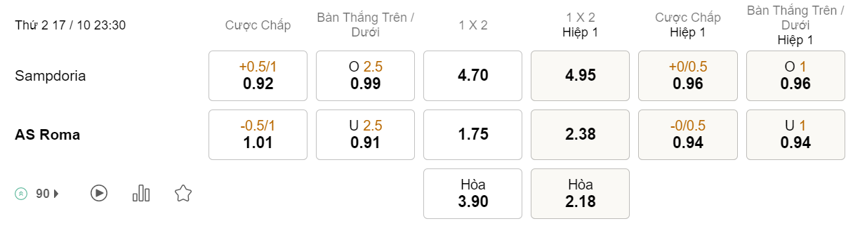 Soi kèo châu Á Sampdoria vs Roma: 0.92*0.5/1*1.01