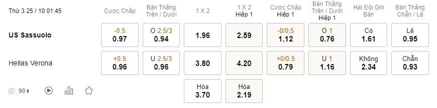 Tỉ lệ kèo Sassuolo vs Verona