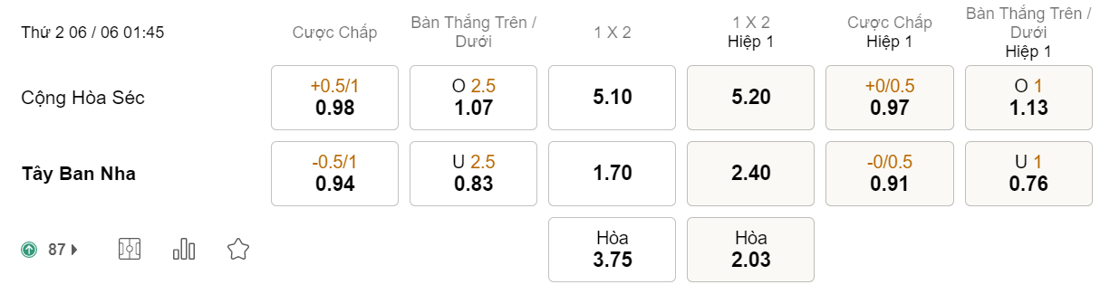 Soi kèo hiệp 1 Séc vs Tây Ban Nha: 0.77*0*1.12
