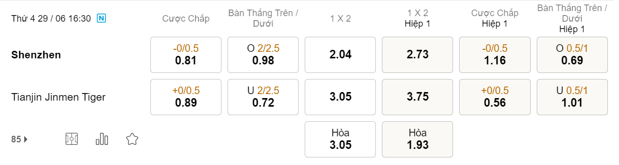 Tỉ lệ kèo Shenzhen vs Tianjin Tiger