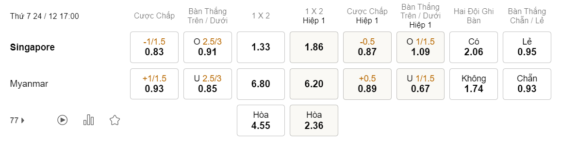 Soi kèo châu Á Singapore vs Myanmar: 0.83*1/1.5*0.93